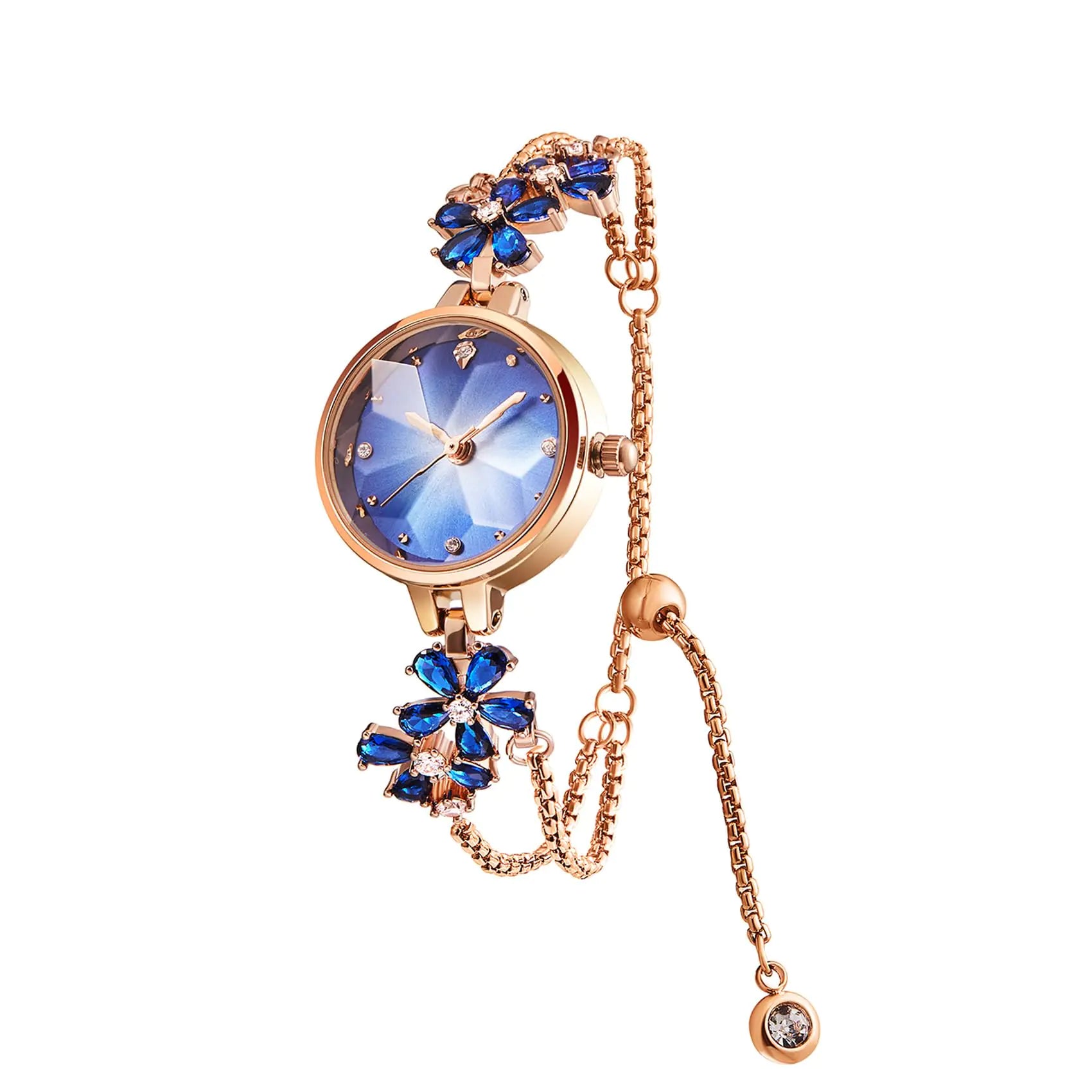 [Blue-tone women watch featuring periwinkle flowers,copper bracelet with stopper Japanese Quartz Movement With Analog Display Cut Mirror Crystal Lens; Purple Dial With Rose Gold-Tone Case And Crystal Accented Markers Case Diameter: 29.5mmStrap Length Can Be AdjustedWaterproof Depth:10m(Withstands Splashes Or Brief Immersion In Water) "Ideal For An Impressive Gifts For Women ValentineS Day MotherS Day BirthdayEngagement"]